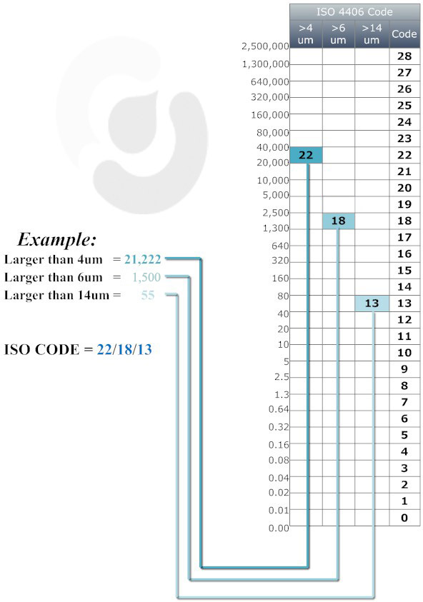 Particle count values are often reported in ISO Cleanliness Codes (ISO Codes). ISO Codes are a scale value derived from the actual particle count value. The ISO Codes are typically reported for three size ranges: 4, 6, and 14 microns.